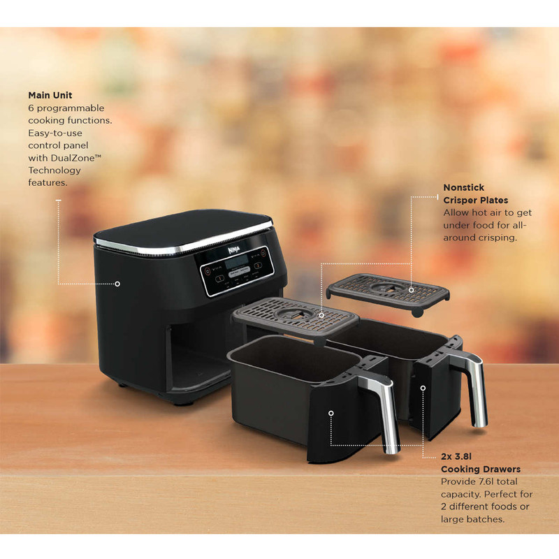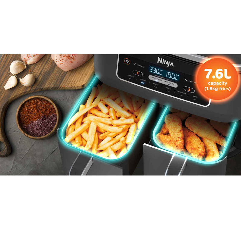 | سایر توضیحات | محدوده دما 40 درجه سانتیگراد تا 240 درجه سانتیگرادبرنامه های پخت : Max Crisp , Air Fry , Air Roast , Bake , Reheat , Dehydrate ( کاملا ترد ، سرخ کن ، کباب کردن ، پختن (کیک و شیرینی و ...) ، گرم کردن مجدد و خشک کن میوه و سبزیجات )فناوری منحصر به فرد DUAL ZONE ™ نینجا به شما امکان می دهد آشپزی خود را با برنامه Match or Sync همگام سازی کنید.دارای 2 سبد پخت مستقل 3.8 لیتری ، تا 1.8 کیلوگرم سیب زمینی سرخ شده یا بال مرغ را همزمان بپزیدتمام اقلام عاری از BPAدارای پایه بدون لغزشقابلیت شستشو اجزاء در ماشین ظرفشویی |
